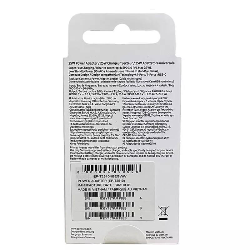 این محصول با تکنولوژی GaN ساخته شده است .همانطور که گفتیم کلگی T2510 یک آداپتور شارژر با پورت تایپ سی است و کابل هایی که دارای سری یو اس بی هستند برای این آداپتور قابل استفاده نیستند. حداکثر شدت جریان خروجی از این شارژر دیواری برابر است با 3 آمپر و این میزان بستگی به ولتاژ ورودی آن دارد که متغیر می باشد و همان طور که گفته شد، حداکثر خروجی شارژر Samsung EP-T2510 برابر با 3.0 آمپر است. آداپتور سامسونگ T2510 از قابلیت شارژ سریع Super-Fast Charge با حداکثر توان 25 وات، PD 3.0 و PPS با حداکثر توان 25 وات پشتیبانی می کند.